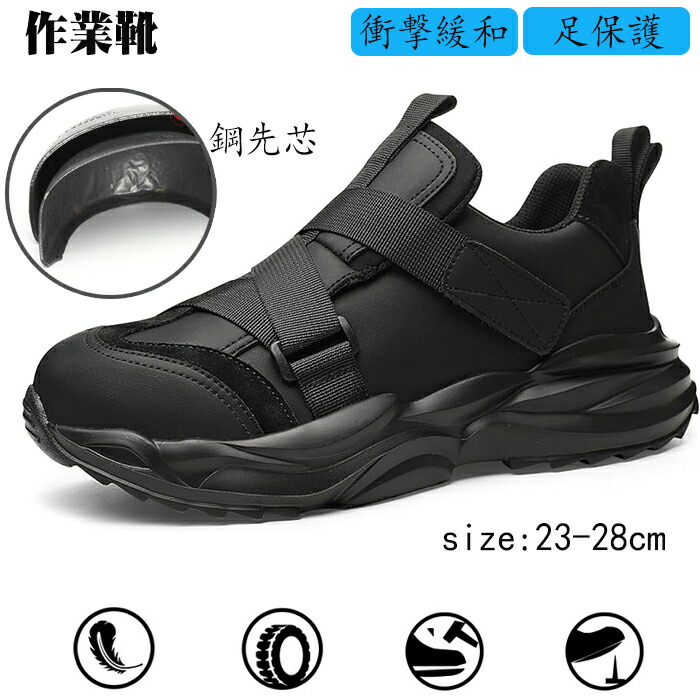 安全靴 メンズ レディース 紐なし 踏み抜き防止鋼先芯入り 作業安全シューズ滑り止め 耐摩耗 撥水性 つま先保護 歩きやすい 24-28 滑り止め