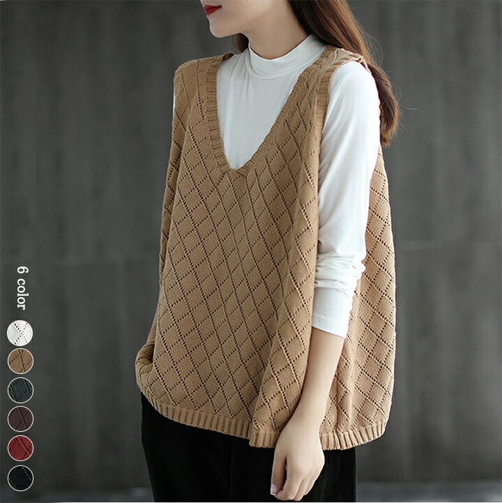 1,000円ぽっきり 2B38 Vネック ダイヤ柄 透かし編みゆったり ニットベスト 幾何学模様 きれいめ シンプル トップス ノースリーブ ベスト レディース ニット セーターニットベスト