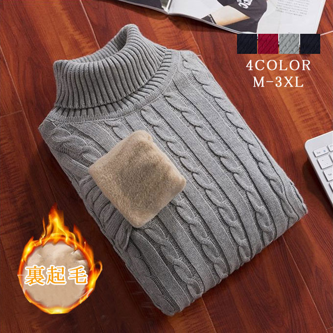 セーター ニット メンズ タートルネック 裏起毛 ニットセーター ケーブル編み 無地 裏ボア 定番 防寒 厚手 あったか 暖かい 細身 紳士服 冬服 大きいサイズ トップス ハイネック 長 M~3XL