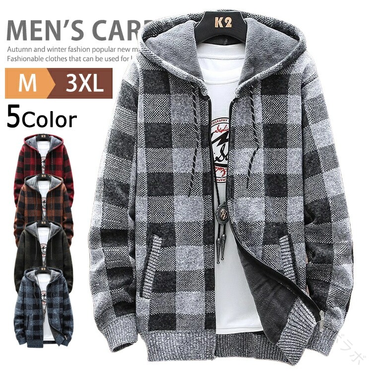 防寒性抜群の厚手ニットカーディガン裏起毛仕様で冬も快適フード付きでおしゃれなチェック柄のメンズトップス