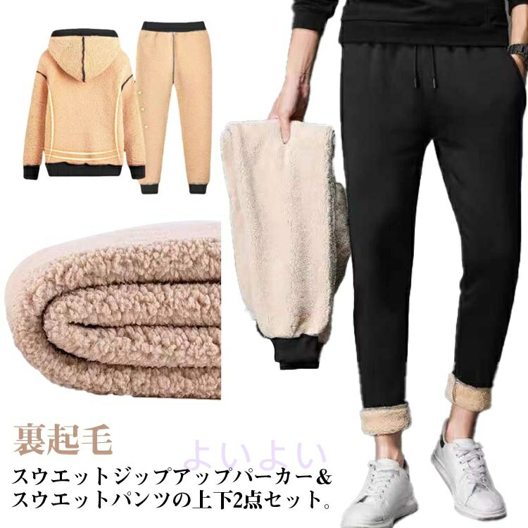 スウエット 裏起毛 裏ボア 2点セット メンズ ジップアップ 厚手 セットアップ パーカー フード付き 長袖 上下 冬 ジャージ スエット ルームウェア 部屋着 秋 ジョガーパンツ