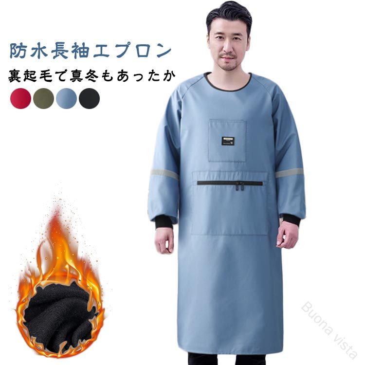 長袖エプロン 裏起毛で真冬もあったか 防水 撥水加工で汚れに強い 大きなポケット 袖口リブ 袖付き 腕カバー 割烹着 冬用フリースロング丈暖かい 袖カバー