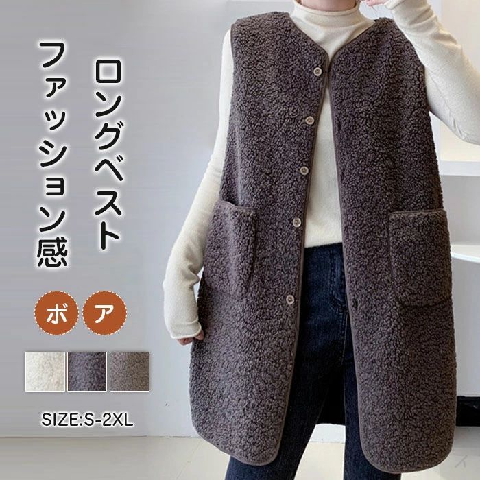 ボアベスト ボアジレ レディース秋冬用前開きロングジレ ロングベスト開襟タイプポケット付きゆったりカーディガン羽織りおしゃれ防寒着